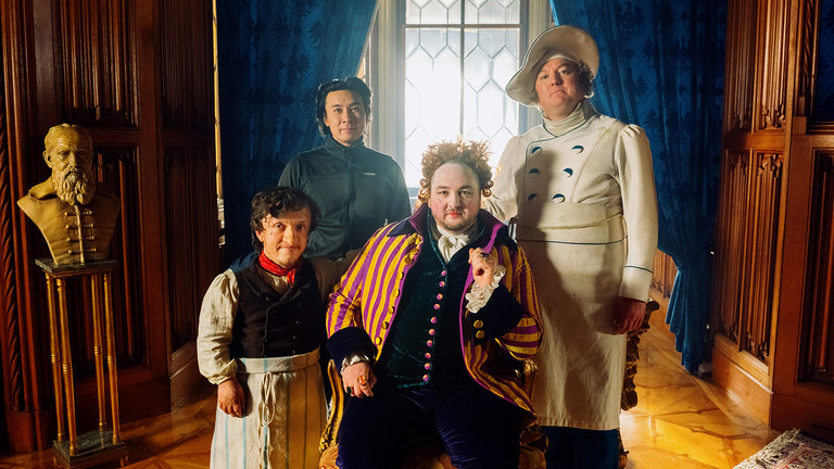 Das ZDF verfilmt das Märchen "Zwerg Nase". Von links: Zwerg Nase (Mick Mehnert), Regisseur (Ngo The Chau), Herzog Kunz der Schlemmer (Daniel Zillmann) sowie der Oberküchenmeister (Christian Ahlers)