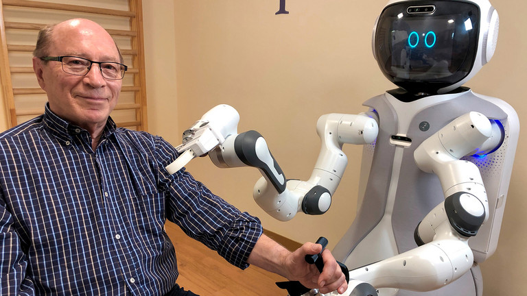 Sieht so die Zukunft in der Pflege aus? Senior und Arzt Günter Steinebach (74) testet einen Assistenzroboter, der das Pflegepersonal mit Blutdruck-Messen und anderen Unterstützungsleistungen entlasten soll.