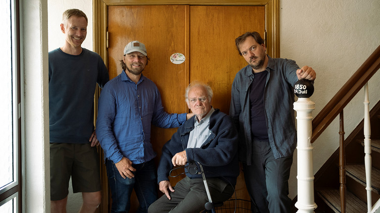 Erstes Teamfoto für die MITTAGSSTUNDE: von links: Kameramann Kristian Leschner, Regisseur und Produzent Lars Jessen mit ihren Darstellern Peter Franke und Charly Hübner an der Tür zur Gaststube des Gasthofs S.Feddersen.