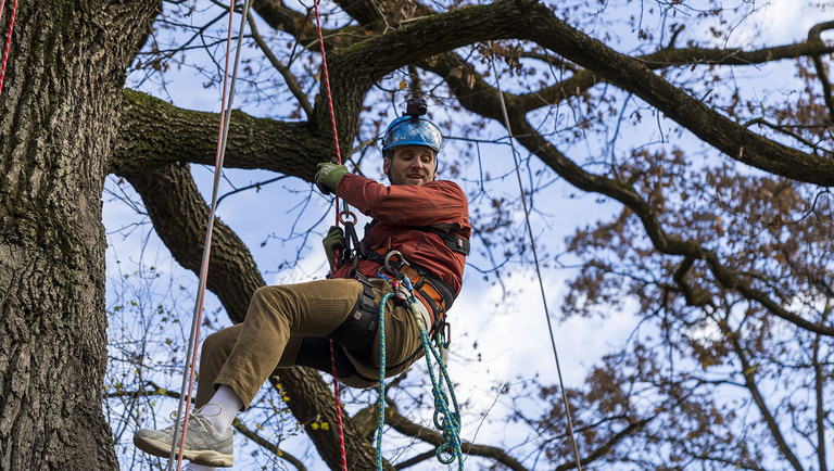 Psychologe und Moderator Leon Windscheid hängt durch im Baum.