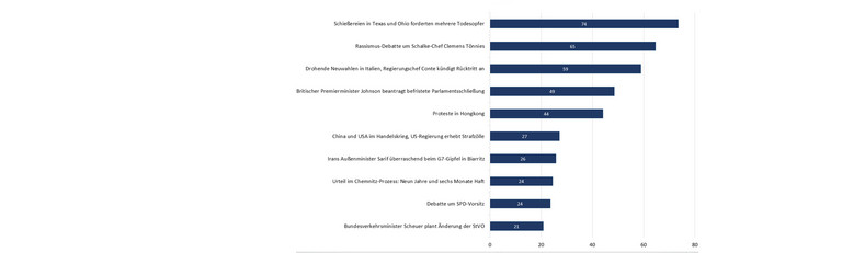 Ein, verglichen mit anderen Monaten, recht geringer Umfang reichte für die Berichterstattung über zwei zeitlich nah beieinanderliegende Amokläufe in US-amerikanischen Städten im August 2019 aus, um auf Rang eins der Top-Themen zu landen. Hier zeigt sich, dass es in der Zeit der parlamentarischen Sommerpause kein Thema gab, das die Berichterstattung klar dominiert hat. Vielmehr ähneln sich die Top-Themen in Bezug auf ihren Umfang. Innenpolitische Themen tauchen kaum in der Rangliste auf. Der erste Themenkomplex mit Schwerpunkt auf deutscher Innenpolitik, die Personaldebatte in der SPD, liegt auf dem neunten Platz.