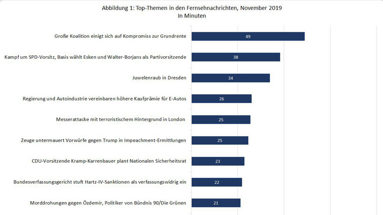 Ein, verglichen mit anderen Monaten, geringer Umfang reicht im November 2019 zwei innenpolitischen Themen, um die Rangreihe der Top-Themen anzuführen. So wird in den untersuchten Hauptnachrichtensendungen und Nachrichtenmagazinen am umfangreichsten über die Einigung der Großen Koalition bei der Grundrente und den Kampf um den SPD-Vorsitz berichtet. Ein Thema aus dem Bereich der Kriminalität rangiert auf Platz 3: der Juwelenraub im Grünen Gewölbe in Dresden, wobei hier klare Unterschiede zwischen den einzelnen Nachrichtensendungen deutlich werden. Außenpolitische Themen spielen in diesem Monat kaum eine Rolle: Lediglich eine Messerattacke mit terroristischem Hintergrund in London und eine Zeugenaussage gegen Donald Trump in den Impeachment-Ermittlungen finden größere Beachtung.