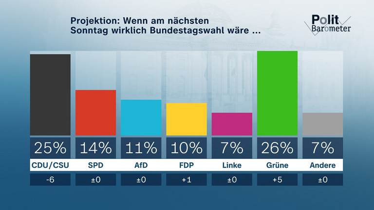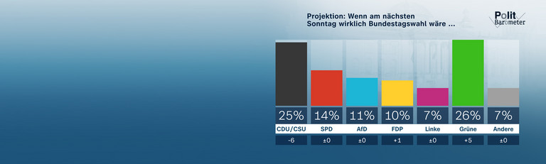 Vor gut zwei Wochen haben CDU/CSU und Grüne entschieden, wen sie ins Rennen um das Kanzleramt schicken. Für beide Parteien gibt es jetzt in der Politbarometer-Projektion starke Veränderungen: Wenn am nächsten Sonntag wirklich Bundestagswahl wäre, käme die Union nur noch auf 25 Prozent (minus 6 im Vergleich zu Mitte April), das ist ihr bisher schlechtester Wert. Die SPD könnte mit 14 Prozent rechnen und die AfD mit 11 Prozent, beide unverändert. Die FDP erhielte 10 Prozent (plus 1), und die Linke bliebe bei 7 Prozent. Die Grünen würden sich mit 26 Prozent (plus 5) deutlich verbessern und damit knapp vor der CDU/CSU liegen. Die anderen Parteien zusammen kämen weiterhin auf 7 Prozent. Damit hätte sowohl eine Koalition aus CDU/CSU und Grünen als auch eine Koalition aus Grünen, SPD und FDP eine Mehrheit. Knapp reichen würde es auch für Grün-Rot-Rot, nicht jedoch für eine Fortführung der Regierung aus CDU/CSU und SPD.