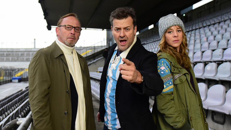 Ludwig Schaller (Alexander Held, l.), Harald Neuhauser (Marcus Mittermeier) und Angelika Flierl (Bernadette Heerwagen)