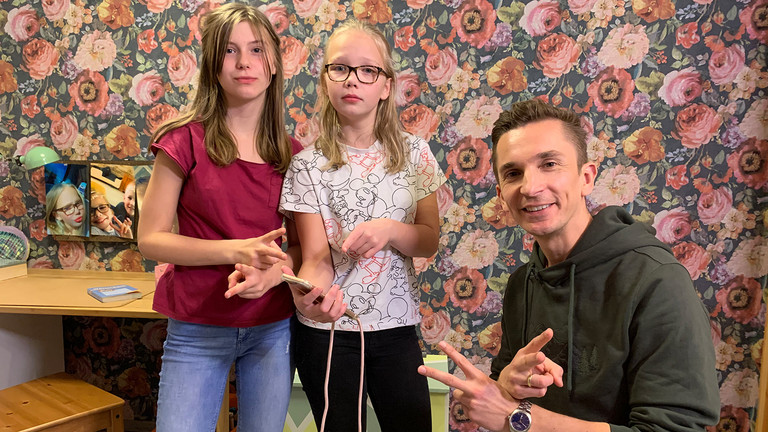 Julia und Lea bringen Eric Grundlagen der Gebärdensprache bei.
