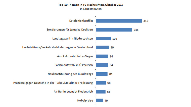 Der Konflikt zwischen Katalonien und der spanischen Zentralregierung um die Unabhängigkeit Kataloniens war das Topthema der wichtigsten Nachrichtensendungen im Oktober 2017. Wie das IFEM Institut für empirische Medienforschung (Köln) in seiner monatlichen Nachrichtenanalyse ermittelte, entfielen in Tagesschau 20 Uhr, Tagesthemen, heute 19 Uhr, heute-journal, RTL aktuell und Sat.1 Nachrichten 315 Minuten (mehr als 5 Stunden) Sendezeit auf diesen Themenkomplex. Zu den inhaltlichen Schwerpunkten gehörten Vorbereitung und Durchführung des Unabhängigkeitsreferendums in Katalonien, die Reaktionen der spanischen Regierung auf die beabsichtigte Loslösung von Spanien, ein gewaltsamer Polizeieinsatz gegen das Referendum bis hin zur Absetzung des katalanischen Regionalpräsidenten Carles Puigdemont.