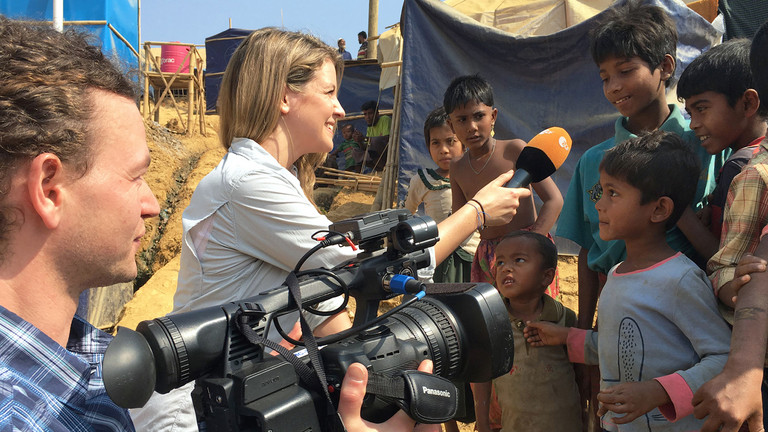 "logo!"-Reporterin Jennifer Sieglar mit ihrem VJ-Kollegen Christian Hill in einem Flüchtlingslager in Bangladesch
