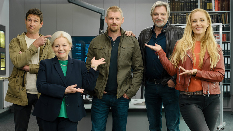 "SOKO Wien"-Drehstart: Von links: Klaus Lechner (Andreas Kiendl), Dr. Henriette Wolf (Brigitte Kren), Max Herzog (Martin Gruber), Carl Ribarski (Stefan Jürgens), Penny Lanz (Lilian Klebow)