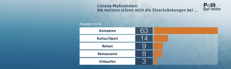 Die aktuelle Situation rund um die Corona-Krise empfinden 14 Prozent als persönlich sehr stark belastend und 36 Prozent als stark belastend. 42 Prozent sagen "nicht so stark" und 8 Prozent fühlen sich davon überhaupt nicht beeinträchtigt. Am häufigsten (63 Prozent) werden dabei die Einschränkungen beim Treffen mit anderen als störend genannt, mit großem Abstand danach die Einschränkungen bei Kultur und Sport (14 Prozent), Reisen (9 Prozent), bei Restaurants (8 Prozent) und beim Einkaufen (3 Prozent). Von einer durch Corona sehr stark oder stark verschlechterten finanziellen Lage berichten ähnlich wie in den Vormonaten lediglich 11 Prozent. 19 Prozent sagen, ihre Situation habe sich deshalb nicht so stark verschlechtert, und 68 Prozent sehen für sich überhaupt keine negativen finanziellen Folgen.