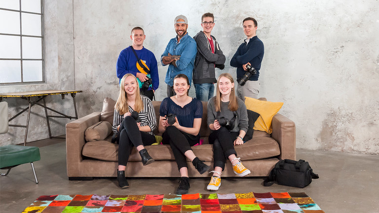 Gute Laune beim Drehstart der Kamerahelden in einem Loft in München, wo die Nachwuchsfotografen erstmals aufeinandertreffen. Ihr Coach heute ist Benjamin Jaworskyj (hintere Reihe, 2. von links).